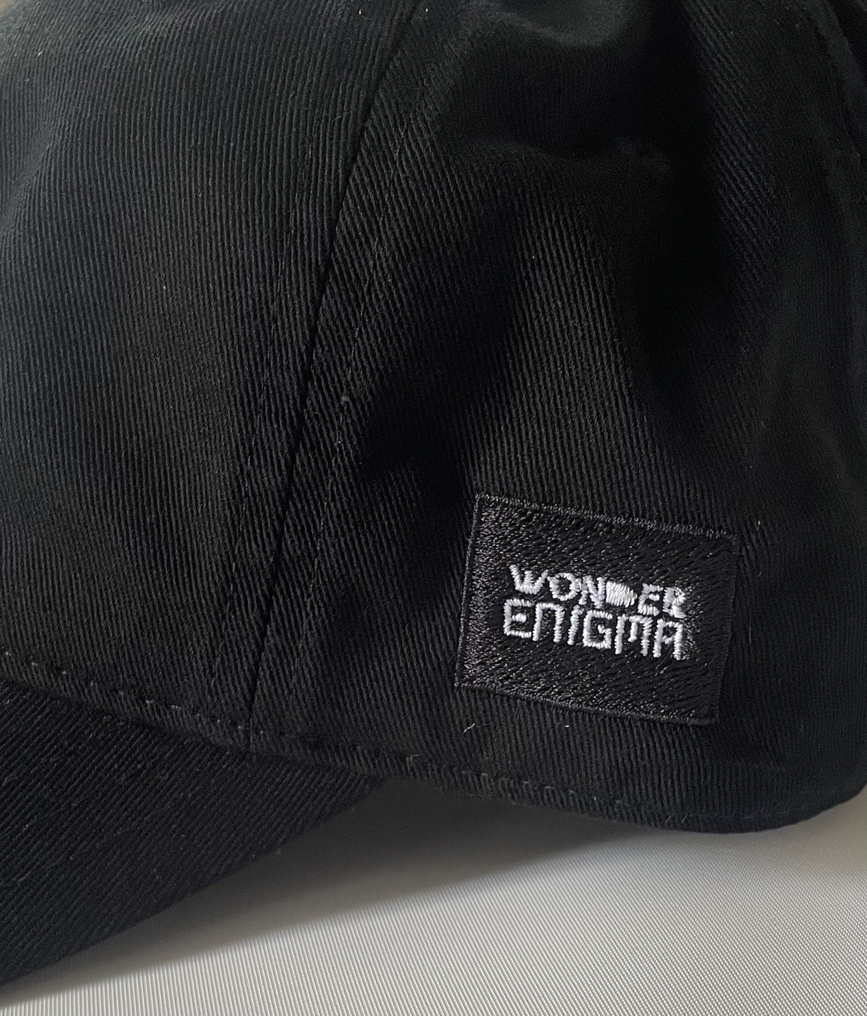 - A minimalist baseball hat showcasing the [Wonder Enigma] Brand logo on the front and a [Wonder Enigma] logo patch-style embroidery on the left side on premium, high-quality material.